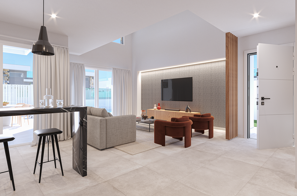 De villa’s kenmerken zich door een eigentijdse architectuur met strakke lijnen, ruime terrassen en grote raampartijen die zorgen voor veel natuurlijk licht. De open woonruimtes creëren een harmonieuze verbinding tussen binnen en buiten, ideaal om het hele jaar door te genieten van het mediterrane klimaat.